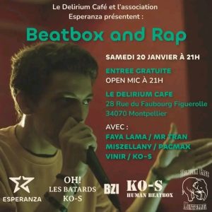 Le samedi 20 janvier 2024, dès 21h, le Delirium Café, situé au plein cœur de Montpellier (France), sera le théâtre de l’organisation de Beatbox And Rap. Cet événement a pour objectif de promouvoir le beatbox mais aussi le rap à Montpellier.