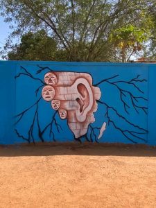 Les fresques, réalisées sur les murs du nord de l’Asecna, offrent un aperçu captivant de la diversité artistique présente au festival. Parmi les œuvres, on peut notamment admirer un mur orné d’oreilles, symbolisant visuellement le thème choisi.