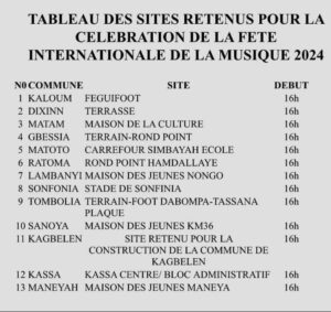 Le ministère de la Culture, du Tourisme et de l’Artisanat, en collaboration avec le gouvernorat de la Ville de Conakry et les délégations spéciales, a coordonné les préparatifs pour que cette journée soit mémorable. Ci-dessous les sites indiqués pour les différentes célébrations.