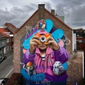 Située près d’une école primaire, cette œuvre a été réalisée à l’occasion du Racines Festival à Bruxelles. À travers le graffiti, on voit une petite fille avec une caméra photo en train de prendre des images. En plus de la fille, certains animaux embellissent également cette réalisation.