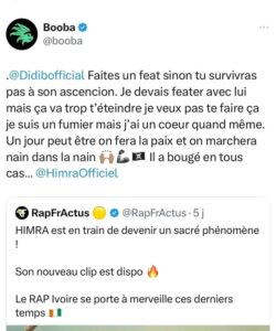 Le clash entre le rappeur français Booba et son homologue ivoirien Didi B continue d’alimenter les débats dans le milieu du rap. La dernière sortie du « Duc« , sur le réseau social X (anciennement Twitter), a relancé la polémique. Booba a en effet conseillé à Didi B, membre du groupe Kiff No Beat, de collaborer avec Himra, une étoile montante de la drill ivoirienne, pour rester pertinent dans le game. Une remarque qui n’a pas été bien reçue par le principal intéressé.