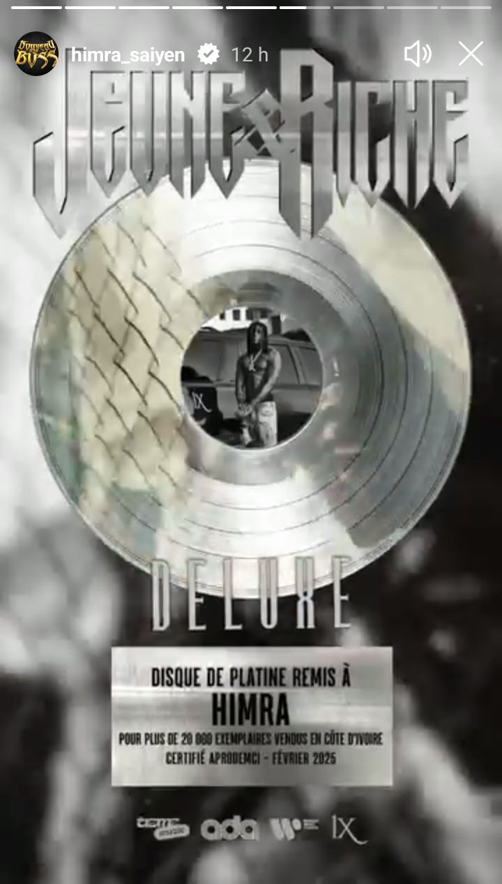 Le succès continue pour Himra ! Le rappeur ivoirien, figure montante de la drill, vient d’obtenir une nouvelle consécration avec son album Jeune & Riche Deluxe. Quelques mois après avoir été certifié disque d’or, le projet franchit un nouveau cap en décrochant un disque de platine, avec plus de 20 millions d’exemplaires vendus en Côte d’Ivoire, selon l’APRODEMCI.