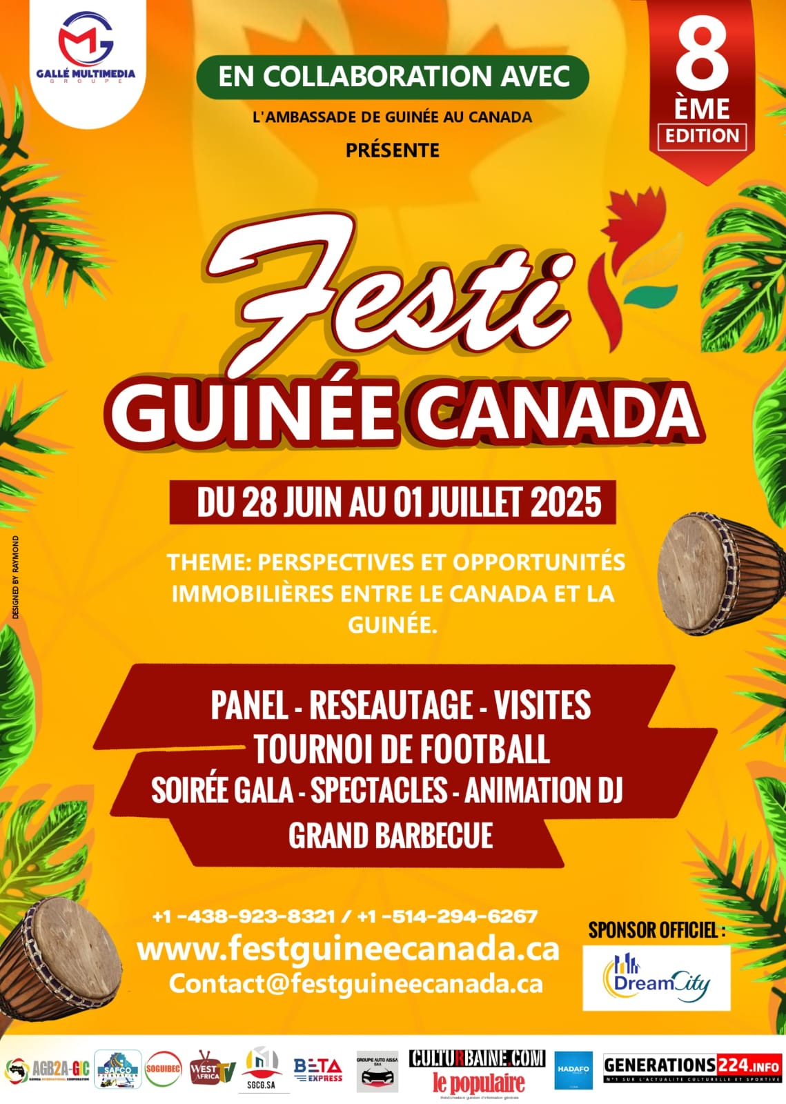 Comme chaque année, les communautés guinéennes et africaines d’Amérique du Nord se retrouvent au Canada pour célébrer leur culture, leur identité et leur unité. Gallé Multimedia Groupe, en collaboration avec l’ambassade de Guinée au Canada, a officiellement annoncé les grandes lignes de la huitième édition du Festi Guinée Canada, prévue du 28 juin au 1er juillet 2025.