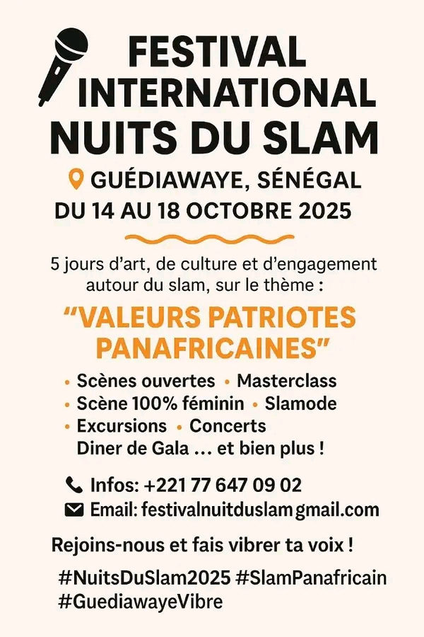 Le slam reprend ses droits à Guédiawaye (Sénégal). Du 14 au 18 octobre 2025, la 8e édition du Festival International Nuits du Slam mettra à l’honneur le thème “Valeurs Patriotes Panafricaines”. Un cri du cœur artistique, un appel à la conscience, porté par les voix puissantes du slam africain.
