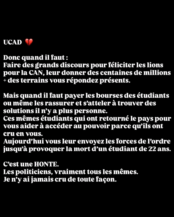 Cette sortie de Nix relance le débat sur les conditions de vie des étudiants, la gestion des revendications sociales et l’usage de la force dans les manifestations. Sur les réseaux sociaux, de nombreux internautes et acteurs culturels expriment également leur indignation et appellent à ce que toute la lumière soit faite sur les circonstances exactes de ce décès.