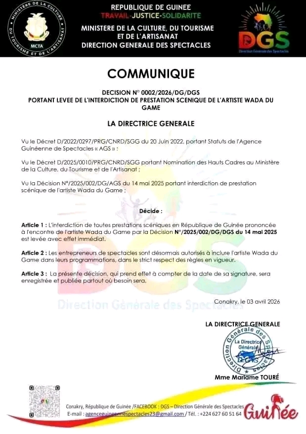L’annonce a été rendue publique à travers une décision relayée sur les canaux de communication de l’institution. Une mesure très attendue par les amateurs de rap guinéen, qui espèrent désormais revoir rapidement l’artiste en live.